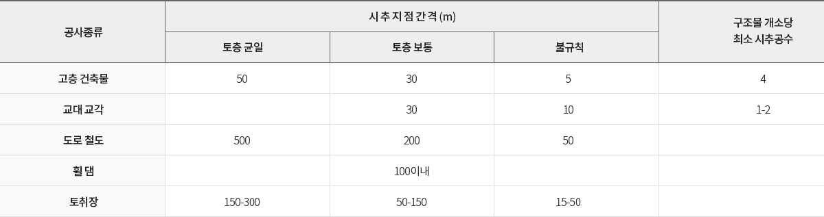 심도별 지내력 파악, 흙의 물리적 특성 및 지하수위 등을 측정하여 안전한 기초설계 자료를 제공하는데 그 목적이 있다.