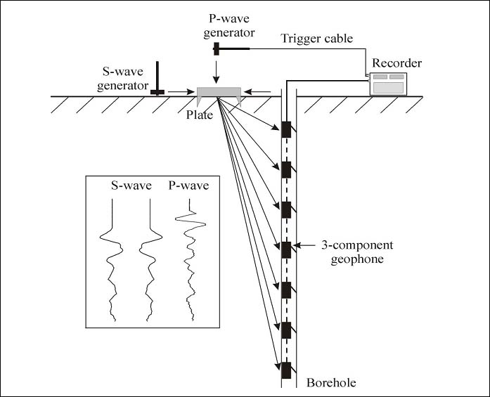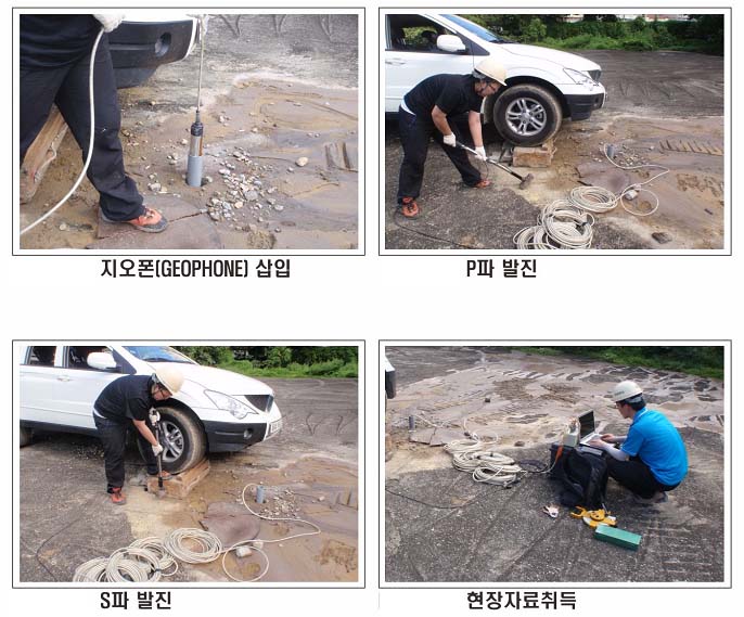 ∙ 송신원에서 발생시킨 탄성파는 수진기에 3축 지오폰을 이용하여 기록하며, 3측 지오폰의 수직축에서 P파를, 2개의 수평축에서 S파를 감지한다.
