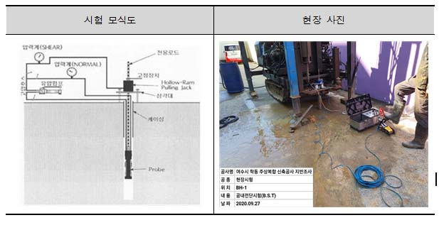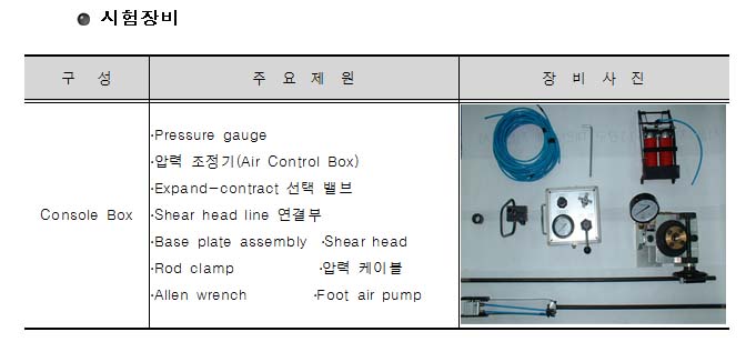 추공 전단시험은 시추공(NX규격)내 시험 심도에 Probe를 삽입한 후 지상에서 핸드펌프를 이용하여 고압호스로 압력을 가하여 시추공 내 전단기(Shear Head)에 수평압력(Normal Stress)을 가하고 Probe와 연결된 Rod를 지상에서 유압잭(Hydraulic Jack)에 의해 인발 하는 과정으로 전단력(Shear Stress)을 가하여 강도정수를 구하는 시험이다.