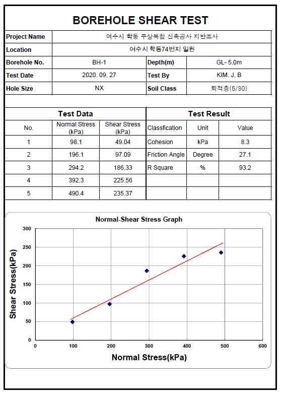 점착력과 내부 마찰각을 구하기 위하여 실내 전단시험과 같이 3회 이상의 시험을 실시하여 얻 어진 자료를 이용하여 수직압력과 전단압력의 관계를 나타내는 Graph, 즉 파괴(전단)곡선에서 점착력(C)과 내부마찰각(ø)을 구한다.